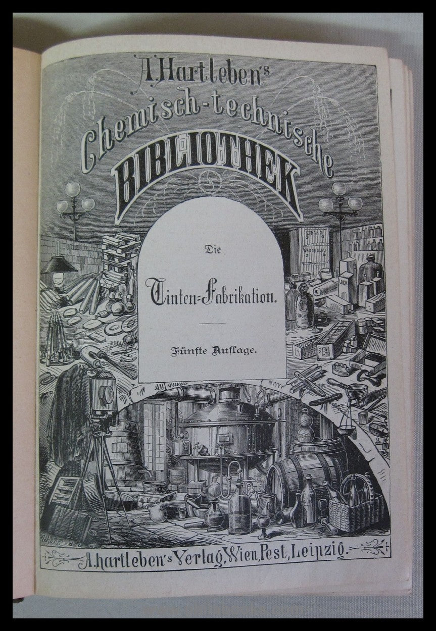 Lehner, Sigmund: Die Tinten-Fabrikation und die Herstellung der Hektographen und Hektographirtinten; die Fabrikation der Tusche, der Tintenstifte, der Stempeldruckfarben, sowie des Waschblaues. Ausführliche Darstellung der Anfertigung [….]. Ein Handbuch [….]. 5., sehr verm. u. verb. Auflage., A. Hartleben‘s Chemisch-technische Bibliothek, Band 17, 1885, Ganzleinen mit Verzierungen und Ornamenten, Titel auf Lederschildchen , der Rücken oben mit Fehlstelle, ansonsten gut erhalten, feste Bindung, interess. Nachschlagewerk für den Prüfer/ Spezialisten alter Hand-und Briefaufschriften und Stempel, ex Pietz