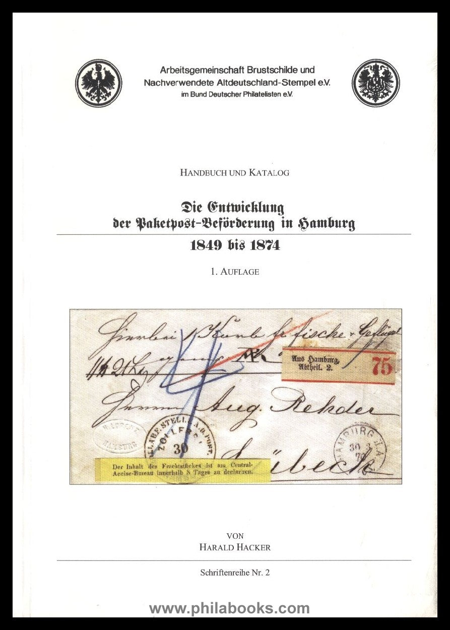 Hacker, H., Entwicklung der Paketpost-Beförderung in Hamburg 1849 bis 1874, 2005, Hdb. und Kat. der Paketzettel u. der Paketbeförderung in Hamburg einschließlich Bergedorf, mit Abdruck der relevanten postal. Verfügungen u. Tarifverzeichnisse, 432 S., mit Abb. Ein Großteil der Auflage verblieb als Jahresgabe bei den Mitgliedern der ArGe Brustschilde. Der Einband Gebrauchsspuren, sonst gut #69367