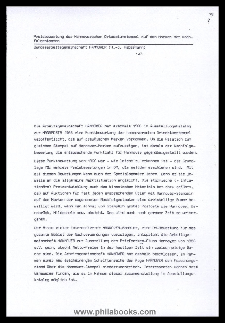 Habermann, H.-J., Preisbewertung der hannoverschen Ortsdatumstempel auf den Marken der Nachfolgestaaten, ca 1990, 7-seitige Kopie mit detallierten Bewertungen auf den Marken von Preussen, NDP und D.R. #69668