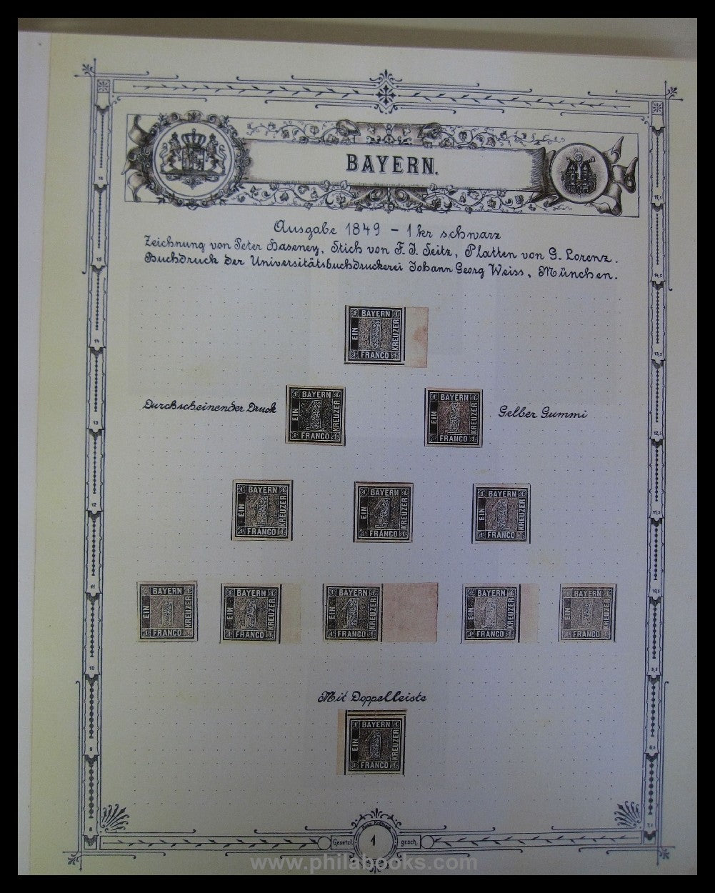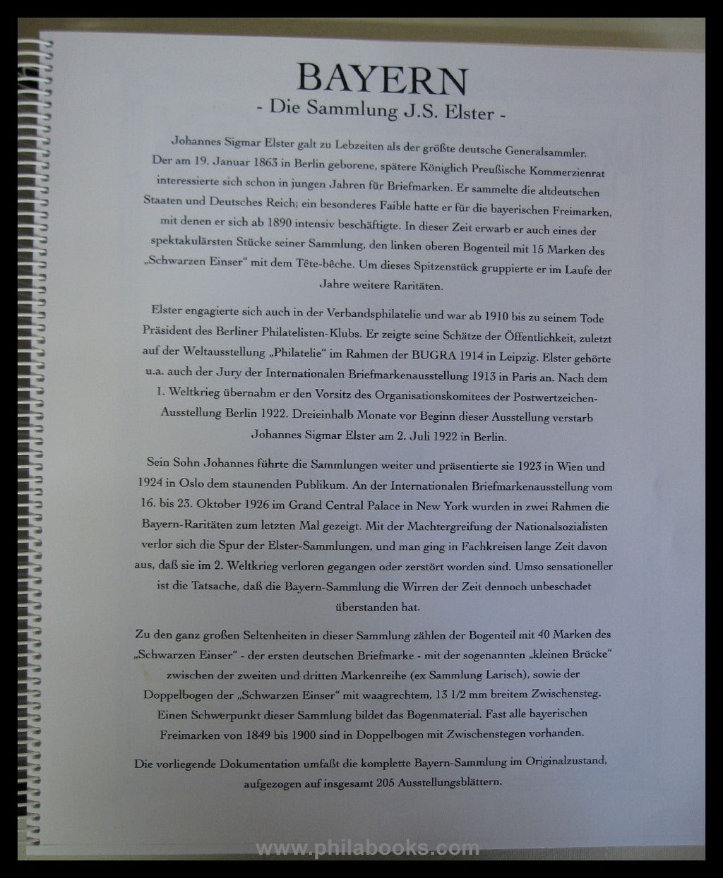 Corinphila Auktionen AG, Sammlung Johannes S. Elster, 1997, Dokumenation der ursprünglichen Sammlung auf den original Sammlungsblättern mit Elsters gut lesbaren handschriftlichen Beschriftungen, Farbe, 205 S. im Originalformat der Albenblätter spiralgebunden, mit Schuber, hier ein überzähliges unnummeriertes Exemplar zur Auflage von 25 Stück, der Schuber kleine Mängel, das Buch kaum Gebrauchsspuren und sehr gut erhalten. Eine unglaubliche Sammlung, es wurde nur ungebrauchte Marken gesammelt, aber mit allem was schön und teuer war, für den großen Bayern-Sammler ein 'Muss'! #70113