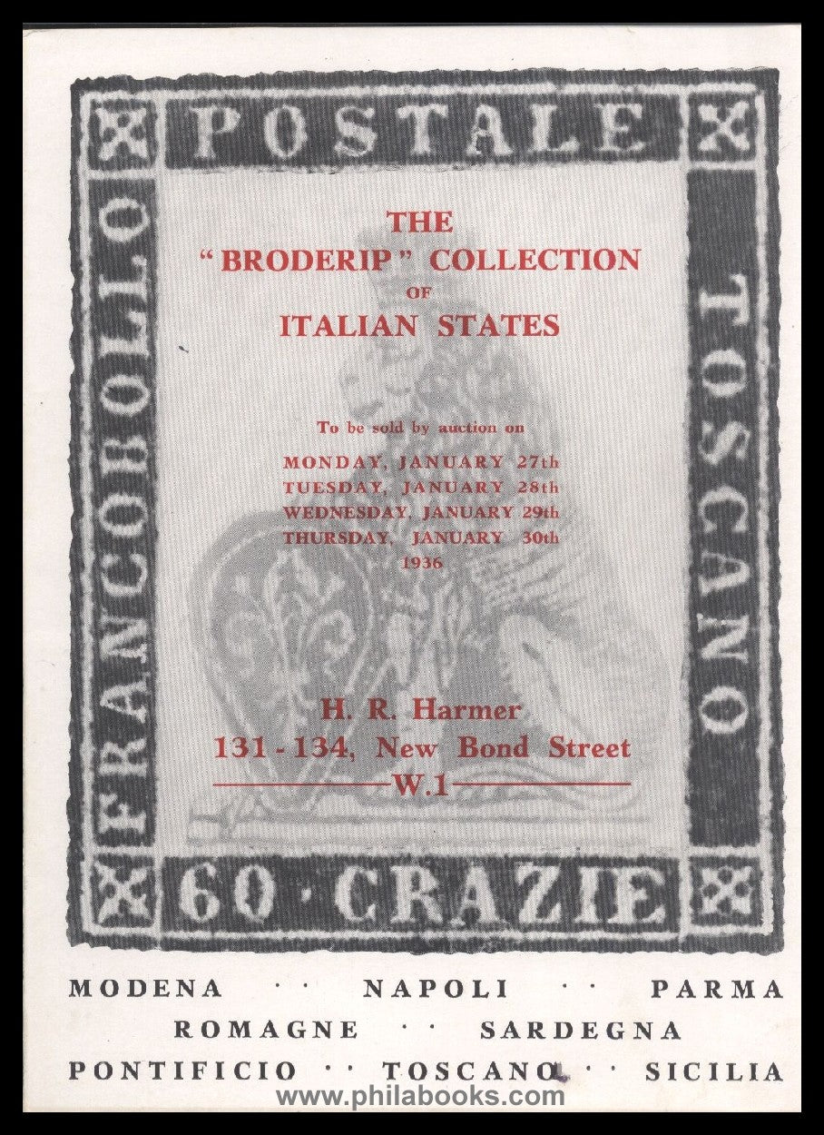 The 'Broderip' Collection of Italian States, H.R. Harmer, London, 27.-30.01.1936, Modena, Napoli, Parma, Romagne, Sardegna, Pontificio, Toscano, Cicilia, 895 Lose, mit Abb. auf 16 Tafeln und im Text, 61 S., angeblich seit Ferrari die beste Italien-Sammlung bis dato, die zur Versteigerung kam, seltener, früher Name-Sale-Katalog, sehr gut erhalten #70620
