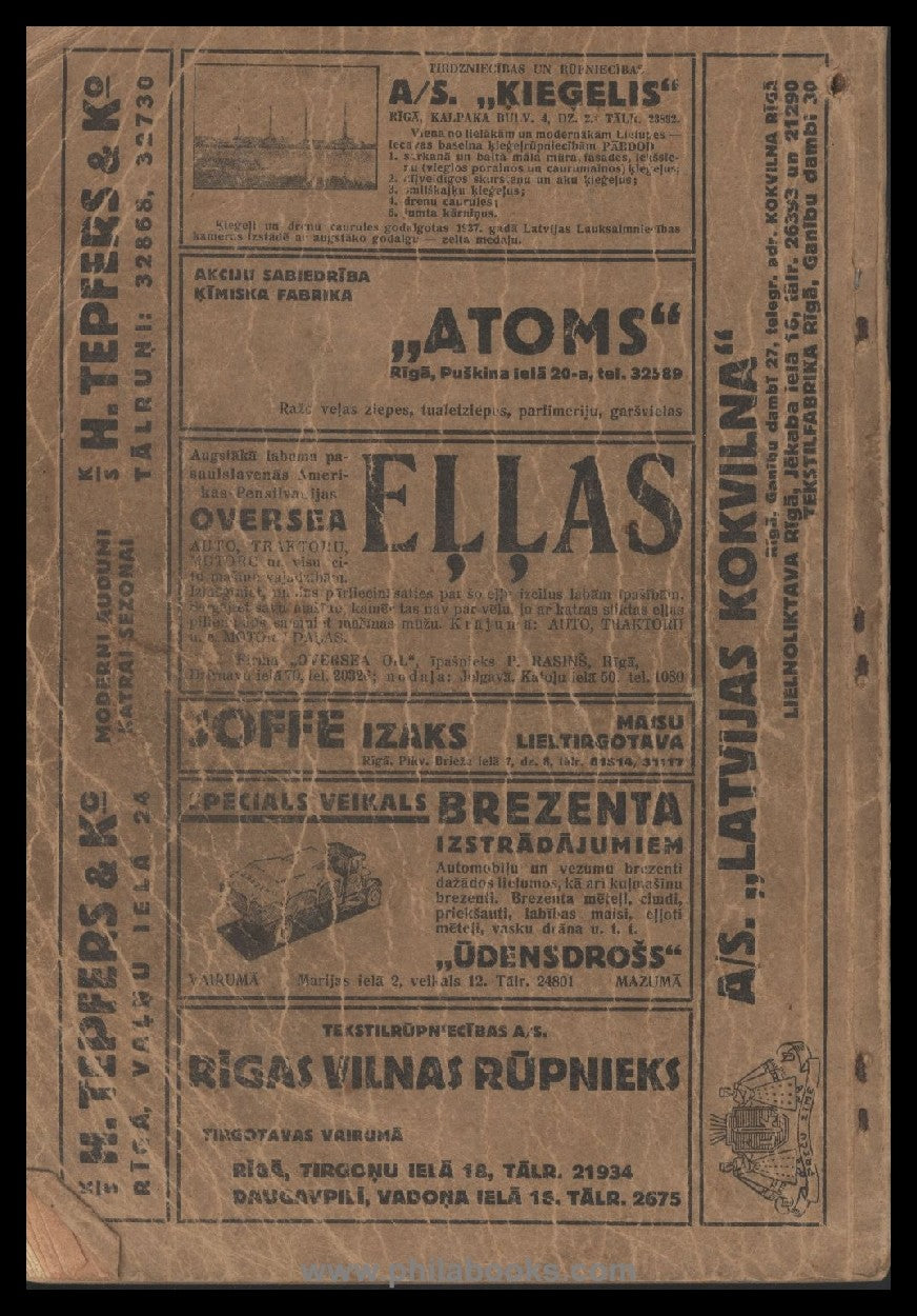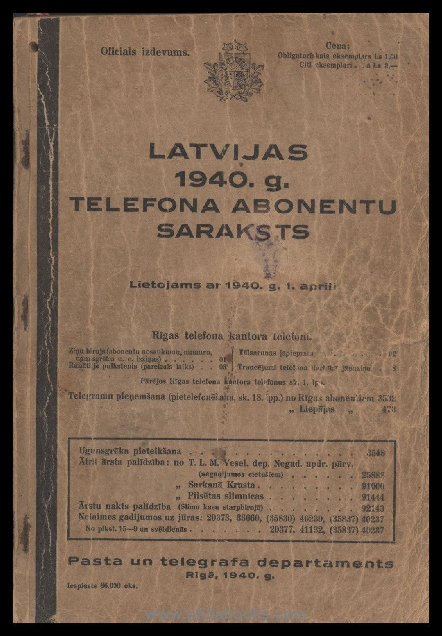 Pasta un Telegrafa Departaments, Latvijas 1940. g. Telefona Abonentu Saraksts, Telefonbuch Lettland 1940, mit Straßen-und Hausnummerangaben, Umschlag leichte Mängel, innen ordentlich erhalten, feste Bindung, wahrscheinlich letzte Ausgabe des unbesetzten Lettlands, #70753