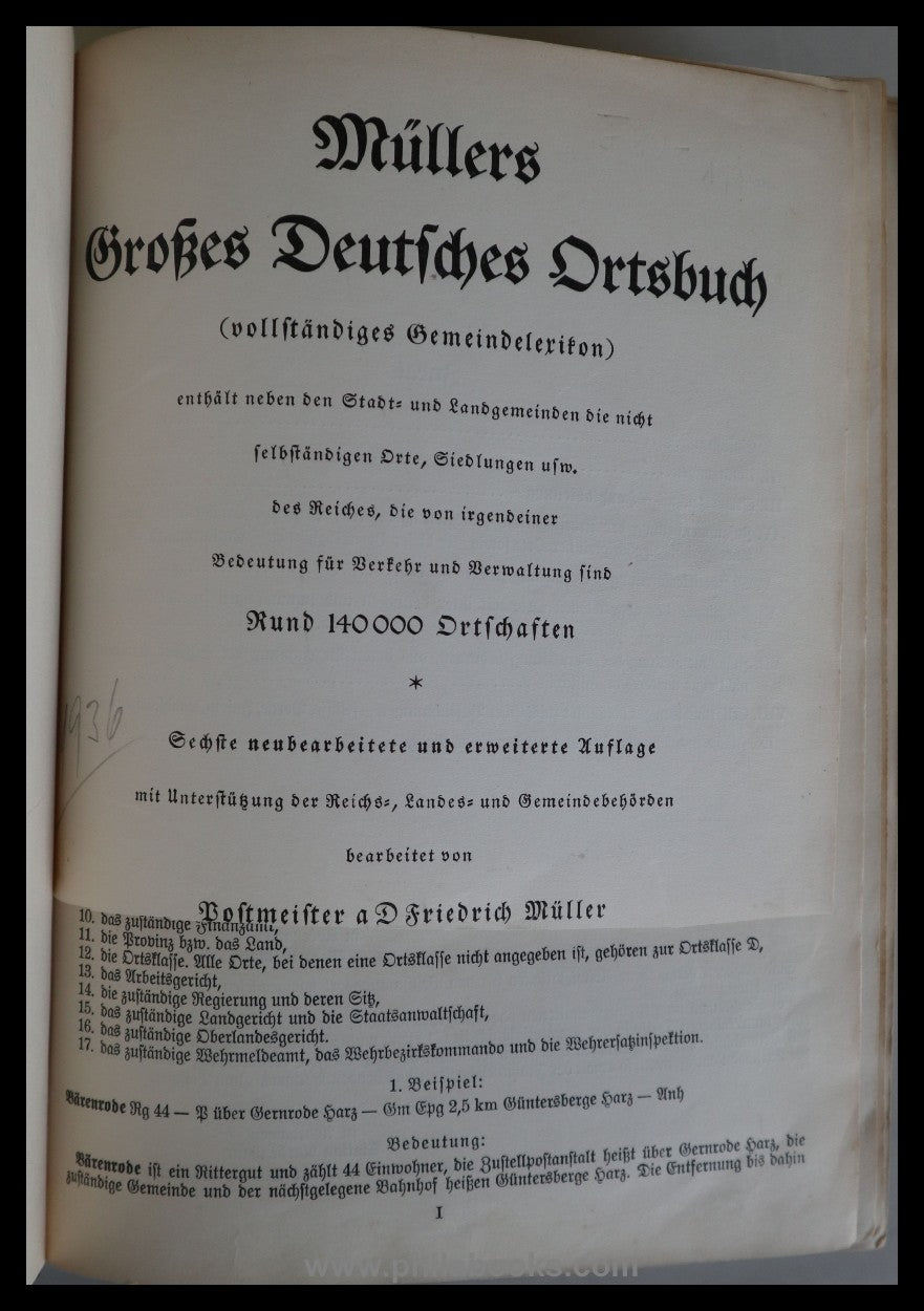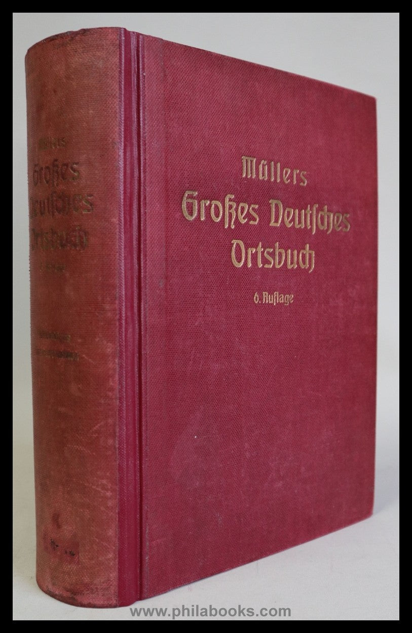 1936, Müllers Grosses Deutsches Ortsbuch, Vollständiges Gemeindelexikon, 6. Auflage, herausgegeben von Postmeister A.D. Friedrich Müller, enthält über 140 000 Ortschaften, 1240 S., die Titelseite unten abgeschnitten, vermutlich wegen NS-Enblem, im Anhang noch der Hauptnachtrag mit 13 S. nachgebunden, schönes Ganzleinen, leichte Alters-und Gebrauchsspuren, noch gut erhalten, feste Bindung. Nicht häufig und in dieser Erhaltung nu noch selten angeboten! #71081