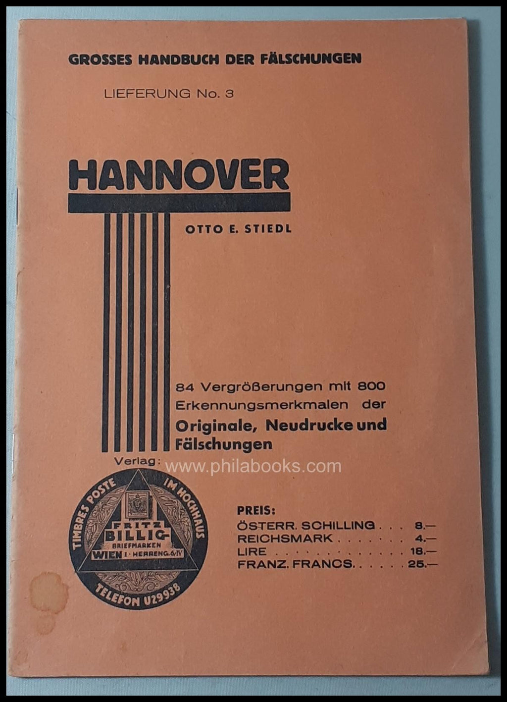 Stiedl/Billig: Großes Handbuch der Fälschungen Lieferung Nr. 3: Hannover, 1935, 24 S., mit 84 Vergrößerungen mit 800 Erkennungsmerkmalen der Originale und Fälschungen, eines der umfangreichsten Hefte der gesuchten Serie, der Umschlag vorderseitig gering fleckig, sonst gut #71474