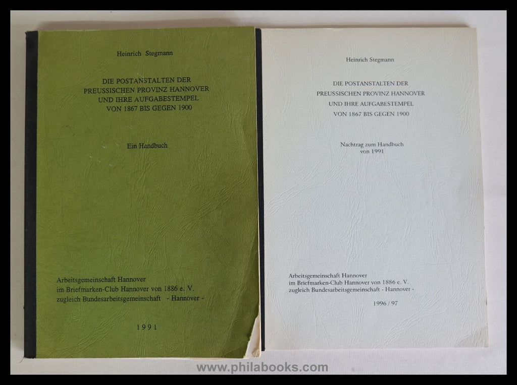 Stegmann, H., Die Postanstalten der preußischen Provinz Hannover und ihre Aufgabestempel von 1867 bis gegen 1900, 1991, 334 S., mit zahlr. Abb., broschiert, stärkere Gebrauchsspuren, kpl. mit dem Nachtrag von 1996/97, ca 50 S., mit Abb., gering gebräunt, sonst gut #71583