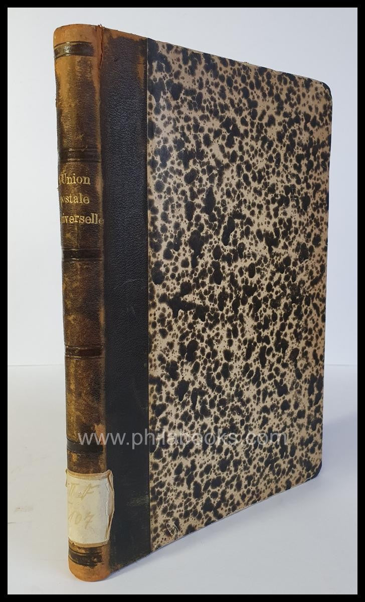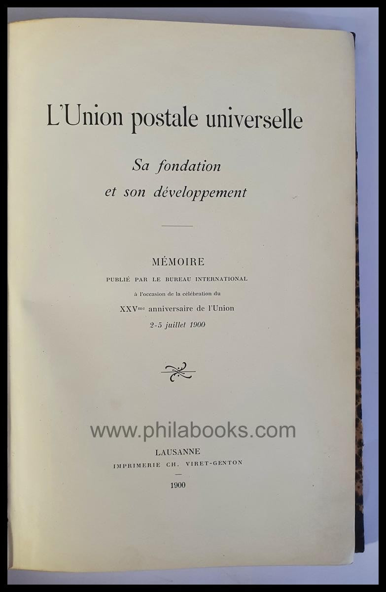 L'Union postale universelle. Sa fondation et son développement. Mémoire publié par le Bureau International á l'occasion dé la célébration du XXVme aniiversaire de lùnion 2-5 juilet 1900, Lausanne 1900, Jubiläumsbuch mit einem Rückblick auf die Konferenzen seit 1863 mit einer Bildtafeln des Gründungshauses und 2 Faltkarten im Angang mit den Mitgliedsländern (die kleine Karte mit Einriss, die große Karte an einer Stelle rückseitig fachmännisch geklebt), 151 S. sowie diverse Tabellen im Anhang mit den Postgebühren der Mitgliedsländer, Halbleder mit Buchecken, Rückenprägung und Marmorierung, mit Einkleber der Bücherei der Reichspostdirektion Braunschweig, der Rücken stark abgegriffen, sonst gut erhalten #71907