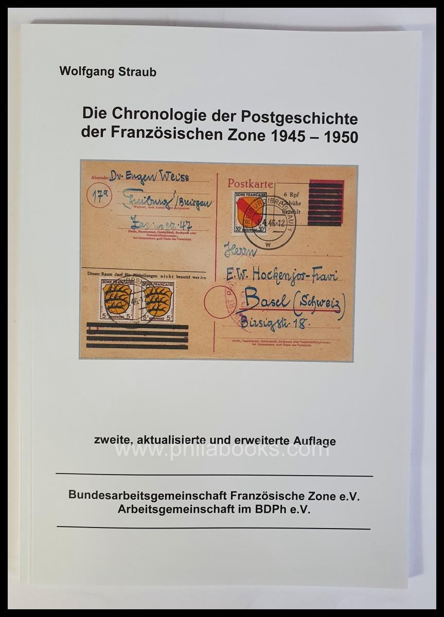 Straub, Wolfgang: Die Chronologie der Postgeschichte der Französischen Zone 1945-1950, zweite, aktualisierte und erweiterte Auflage, 2020, interessante Dokumentation ähnlich einer Ausstellungssamlung mit ausgesuchten und genau beschriebenen Belegen, Farbe, 120 S. #71930