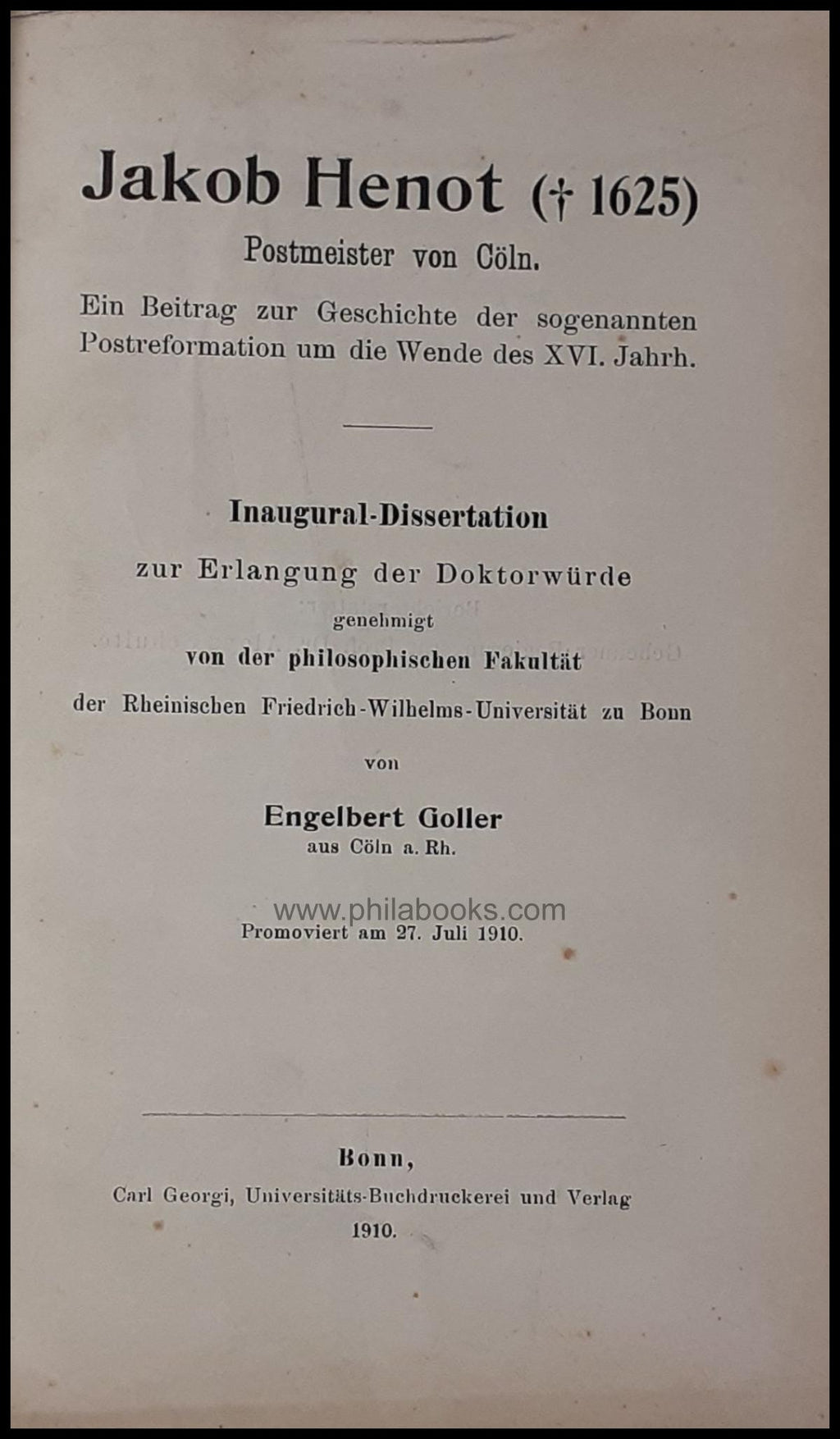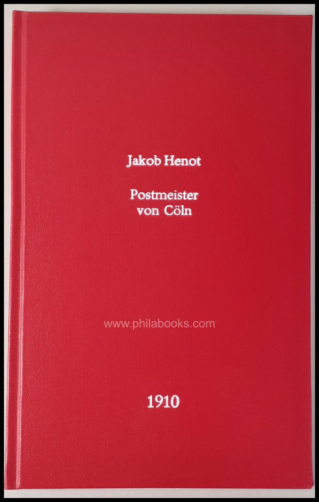 Goller, E., Jakob Henot (gest. 1625), Postmeister von Cöln. Ein Beitrag zur Geschichte der sogenannten Postreformation um die Wende des XVI. Jahrh., Inaugural-Dissertation, Universität Bonn, 1910, hier das erste Original was wir bisher anbieten können, vorzüglich neu in rotem Ganzleinen gebunden mit Deckel-und Rückenprägung, das Titelblatt geringe Altersspuren, sonst gut erhalten #72361