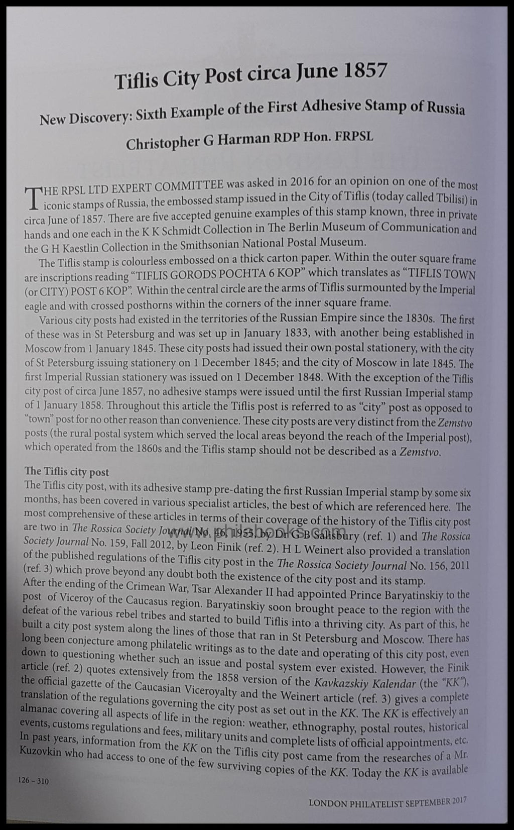 Harman, C.,G.,Tiflis City Post circa June 1857 & Jensen, S., Chr.,Russian Censorship in Tornio, Beiträge in The London Philatelist, Number 1448, September 2017 #72671