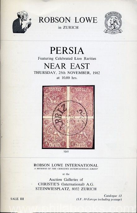 Persia Featuring Celebrated Lion Rarities / Near East, Spezialauktion RL Zurich, 25.11.1982, Auflösung einer interessanten Persien-Sammlung mit zahlreichen Raritäten aus bekannten Sammlungen, 135 Lose, viele Abb., einige Farbtafeln. Der 'Near East'-Teil mit Auslandspostämtern in der Türkei, Levante und Holyland. Gesamt 301 Lose, 47 S. #8338