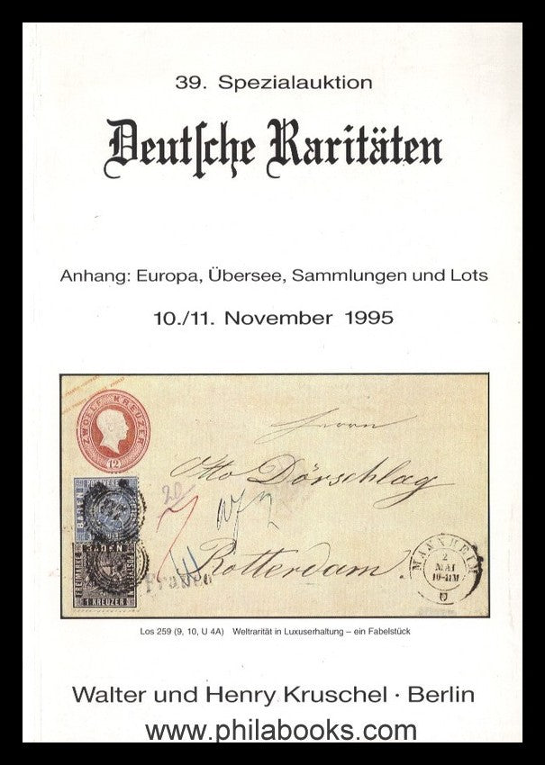 Kruschel, Walter und Henry 39. Spezialauktion, Deutsche Raritäten 10./11.11.1995, dabei viel Altdeutschland, auch Thüringen nach 1945, gesamt 941 Lose, viele abgebildet auf 203 Ft., auf Rückumschlag Baden 100 Kr.-Frankatur nach Rom, EL #8360